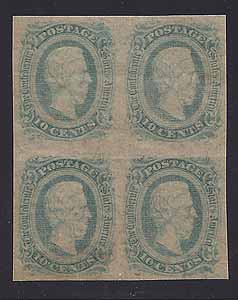 CSA #11c (AD) Block of 4 UNUSED Greenish-Blue (4-Margin) OG with the top two stamps Hinged and the bottom two stamps NH. |