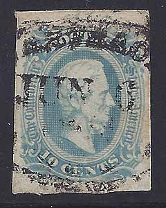 CSA #11a (AD) Milky Blue USED (4-Margin) with the oval Wartrace N&C RR (Nashville & Chattanooga Railroad) postmark 6 JUN 1863. Very Fine. |