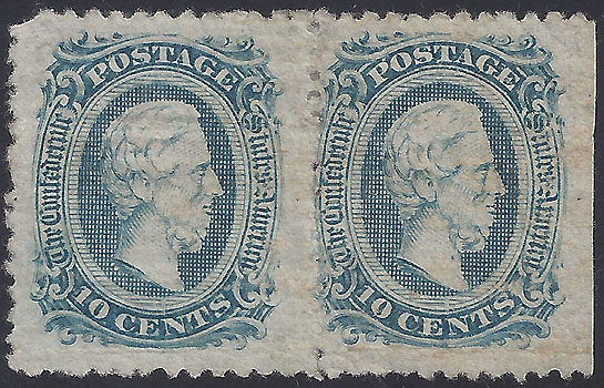 CSA #11e (AD) Horz Pair Officially Perforated 12 1/2 UNUSED (full margins on all four sides), Staright edge at the right from the edge of the sheet. Typical uneven perforations and partially blind perforations between the stamps. No Gum. Two light horizontal creases seen only from the back. Tiny thin in the right stamp. Multiples of the officially perforated stamp, even a pair, are very scarce. Very Fine appeance. PSAG Certificate 2016. |