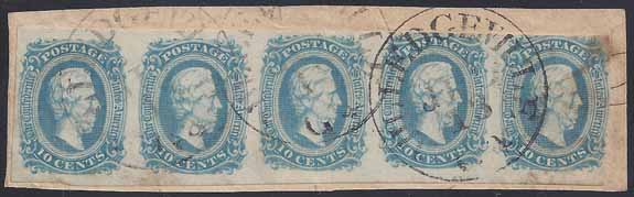 CSA #11 (AD) Horz Strip of 5 USED (margins just a little tight in a few spots) tied to a small piece by three strikes of the Milledgeville, Ga CDS 13 JUL. Stamp at the far right has a little light staining at the upper right corner. Large used piece cut from a large cover paying a 5x rate for weight. |
