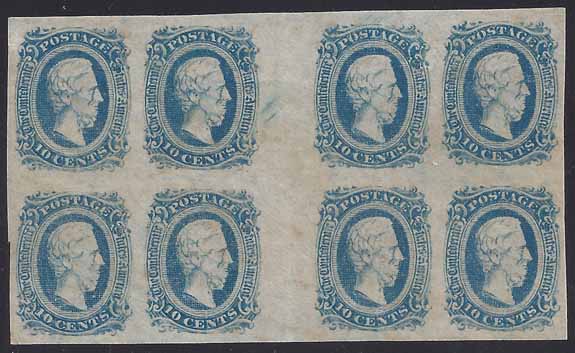 CSA #11 (AD) Gutter Block of 8 UNUSED (4-Margin) No Gum. Extremely light fold in the gutter barely discernible. The gum having been removed years ago allowed the stamps to retain a fresh color with no toning. Very Fine. |