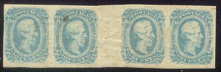 CSA #12 (AD) UNUSED Horz Gutter Strip of 4 (4-Margin) with usual fold OG Hinged. The stamp to the left of the gutter has a small repaired hole. Still a very decent appearing gutter strip. |
