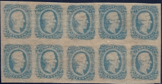 CSA #12 (AD) Horz Block of 10 (2 Rows of 5) UNUSED (4-Margin) with full OG and hinged. A little gum toning and staining on the back only. Very Fine overall appearance in a light blue color shade. |