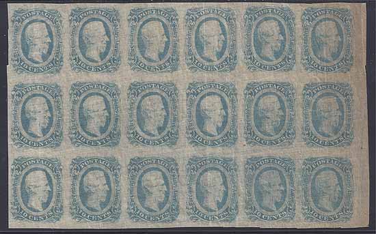 CSA #12 (AD) Horz Block of 18 UNUSED (3 Rows of 6) (4-Margin with a small right sheet margin) Full OG and NH. Usual light gum toning, gum cracks and gum creases. Very Fine. |