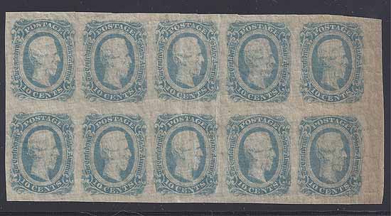 CSA #12 (AD) Horz Block of 10 UNUSED (2 Rows of 6) (4-Margin with a small right sheet margin) Full OG and NH. Usual light gum toning, gum cracks and gum creases. Very Fine. |