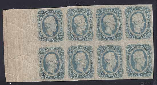 CSA #12 (AD) Horz Sheet Margin Block of 8 UNUSED (2 Rows of 4) (4-Margin with a large left sheet margin) Full OG and NH. Usual light gum toning, gum cracks and gum creases. Very Fine. |
