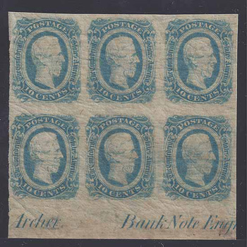 CSA #12 (AD) Horz Block of 6 UNUSED (4-Margin) OG with a sealed edge tear at the upper left. Lower Sheet Margin with Part Imprint 4th State “& Daly” removed. |