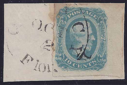 CSA #12 (AD) Blue with an Opaline sheen (4-Margin with a right sheet margin and a little toning at the upper left corner) tied to small white paper piece by a partial strike of the Quincy, Flor CDS 2 OCT. |