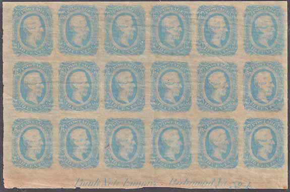 CSA #12b (AD) Block of 18 UNUSED in a Light Blue color shade (4-Margin with a lower sheet margin) OG NH. Imprint block from the Left Pane with the 5th State Plate No 4 (Final State) Imprint (firm name completely removed as well as the "s" from "Engraver") (CC 12-AD-if).