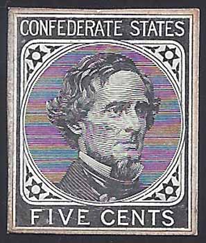 appearance and scarce. The colored lines behind the portrait are a scanning artifact caused by the glazed card on which the proof is printed and are not on the stamp. Behind the portrait are thin black horizontal lines which do not scan well. |