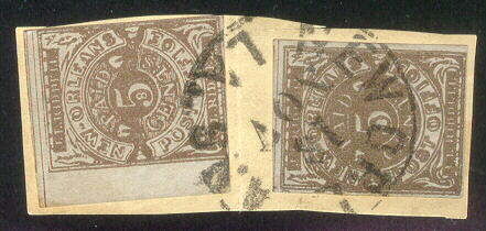 CSA #62x4 5c Brown New Orleans Provisional on Bluish Paper two singles USED (one stamp with margins touching bottom and right but with a large left sheet margin, and the other stamp with margins close at the bottom and left) on small piece tied together and to the piece by the New Orleans, La CDS 18 NOV (1861). Stamps show two distinct color shades on the same bluish paper indicating that they come from different sheets. |