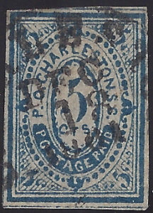 CSA #16x1 Charleston 5c Blue Provisional USED Type A (4-Margin with full outer frame at bottom, most of the outer frame at top, and part of the frame at left) with a neat strike of the large single rim Charleston SC CDS 18 DEC 1861. Very minor thins and creases. Very Fine overall appearance. |