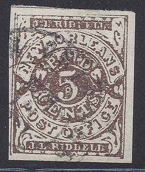 CSA #62x3 New Orleans 5c Brown Provisional USED (4-Margin) with the black small double circle New Orleans River Mail CDS with a JUN 1861 date. Very Fine, |