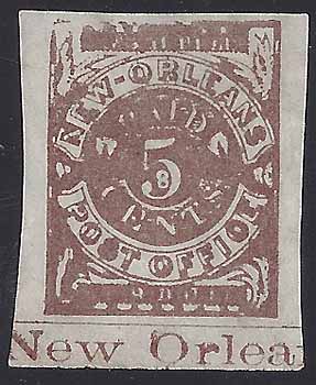 CSA #62x5 5c Yellow Brown New Orleans Provisional UNUSED Position 37 (4-Margin with lower sheet margin) No Gum, Part Lower Imprint "New Orlea," small hinge thin top center. |