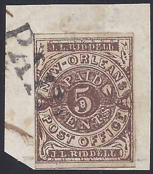 CSA #62x3 5c Brown New Orleans Provisional USED (4-Margin but a bit tight left and right) tied to small piece by a PAID cancel Very Fine. |