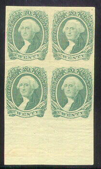 CSA #13 UNUSED Block of 4 (4-Margin with a very large lower sheet margin) Full OG. Top two stamps LH and bottom two stamps with sheet margin NH. Very Fine. |